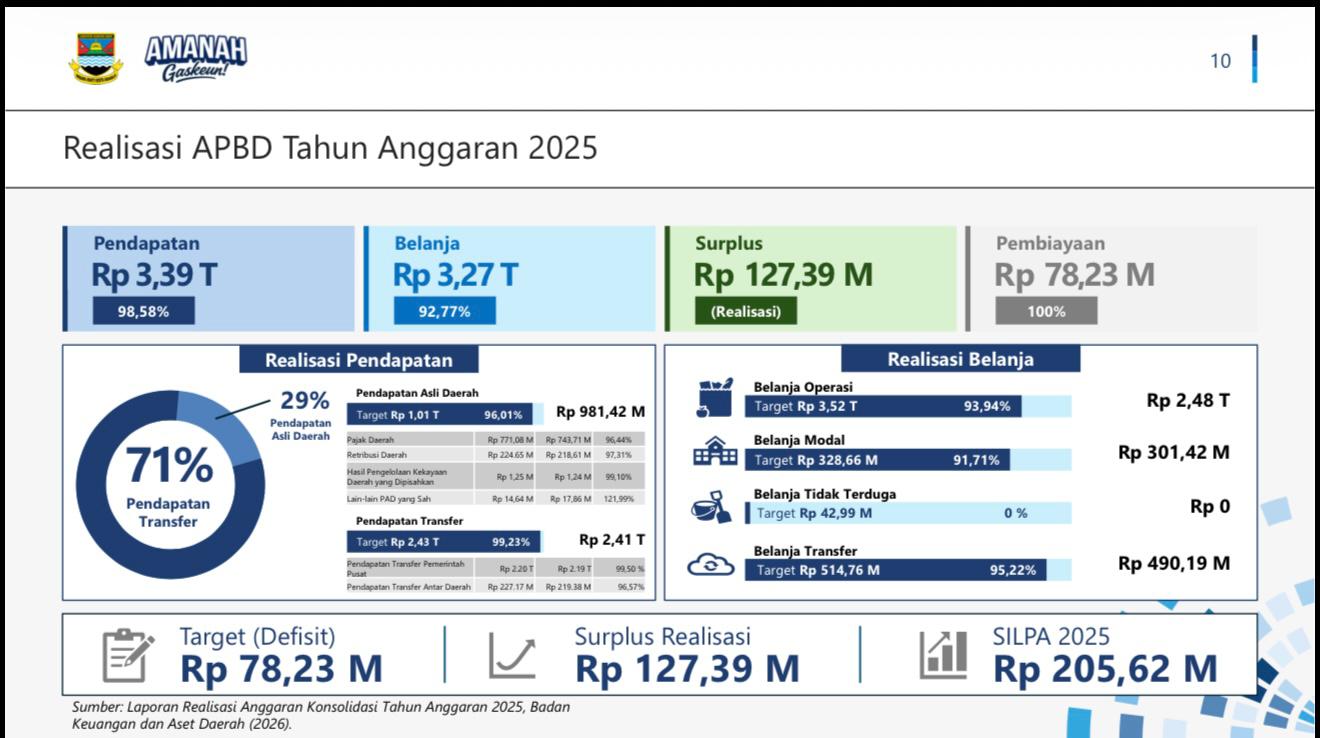 Terdapat surplus anggaran sebesar 127,39 miliar berdasarkan perhitungan realisasi pendapatan sebesar 98,58% di kurangi realisasi belanja sebesar 92,77% sedangkan terdapat silpa 205,62 miliar di tahun 2025 yang di akibatkan terdapat realisasi belanja yang tidak sesuai target harusnya dijelaskan oleh Tim Anggaran Pemerintah Daerah (TAPD) silpa tersebut berasal dari apa aja?